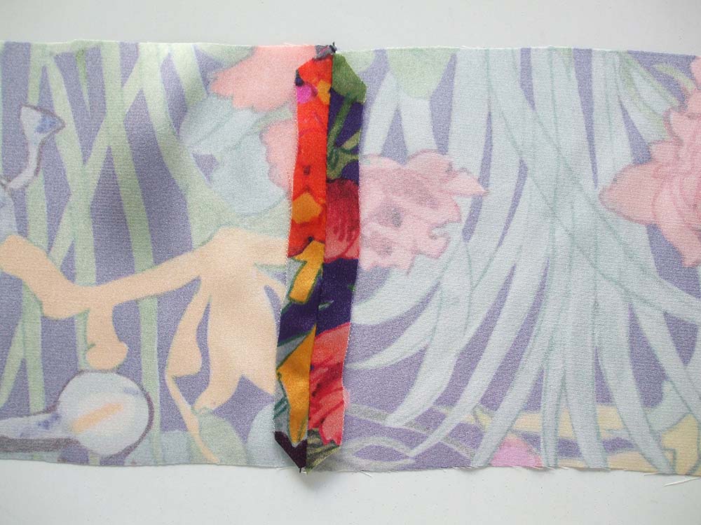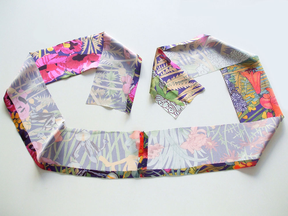 Join the front band pieces at one short side to make one long strip with a 1cm seam allowance. Press the seam allowances open. Topstitch either side of the seamline.