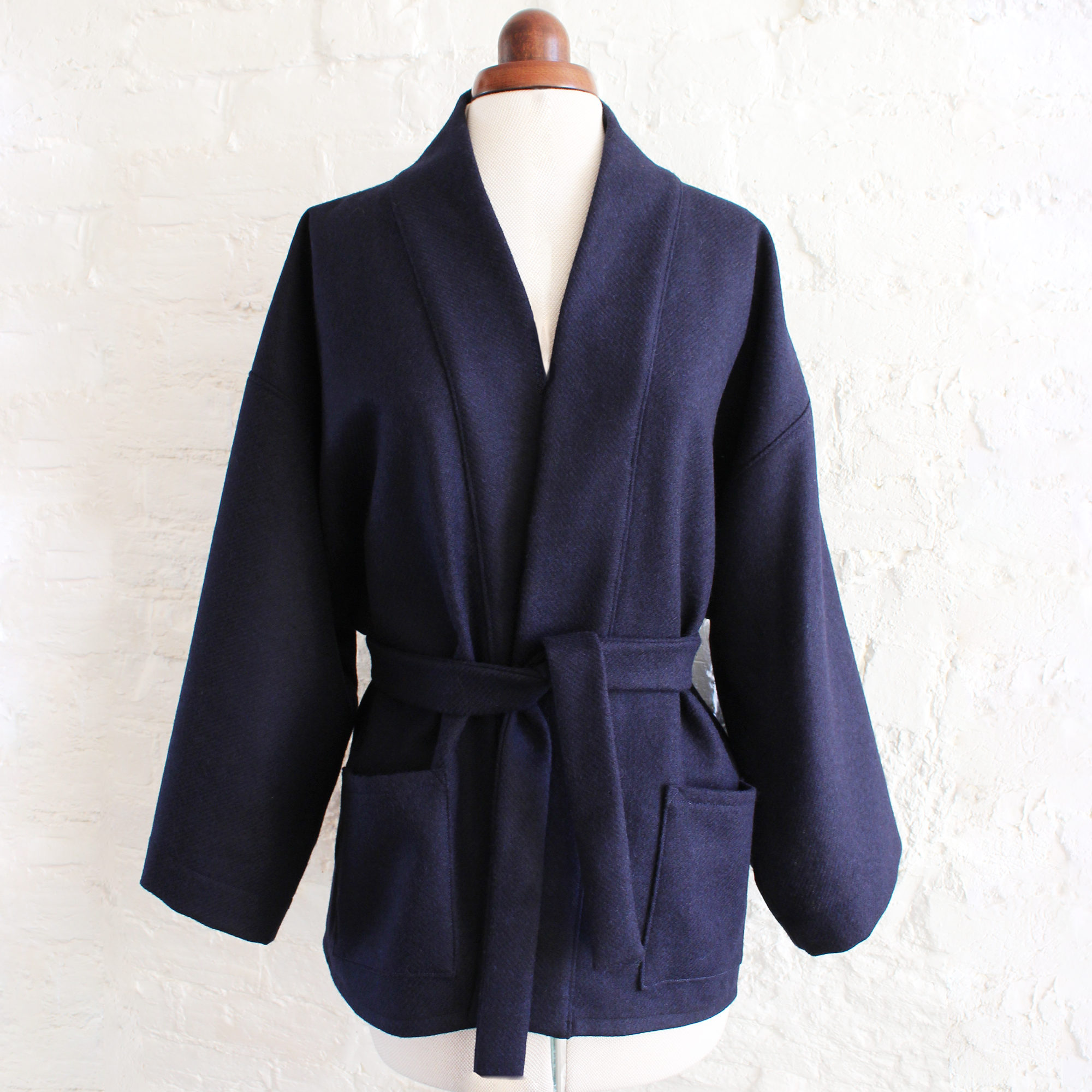 This is a loose fitting hip length kimono which looks great in all seasons, either for a special occasion or as a loose fitting cardigan. With a wide front band, two optional patch pockets, and french seams on the inside, its an easy, fun and quick to make.