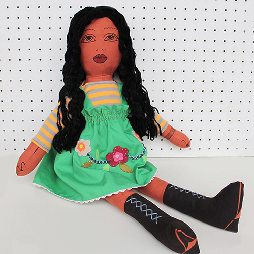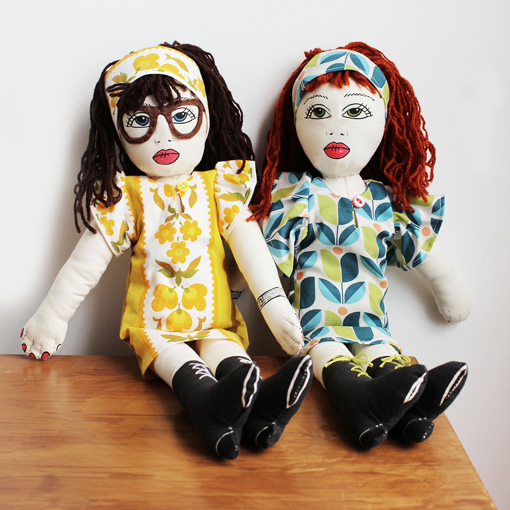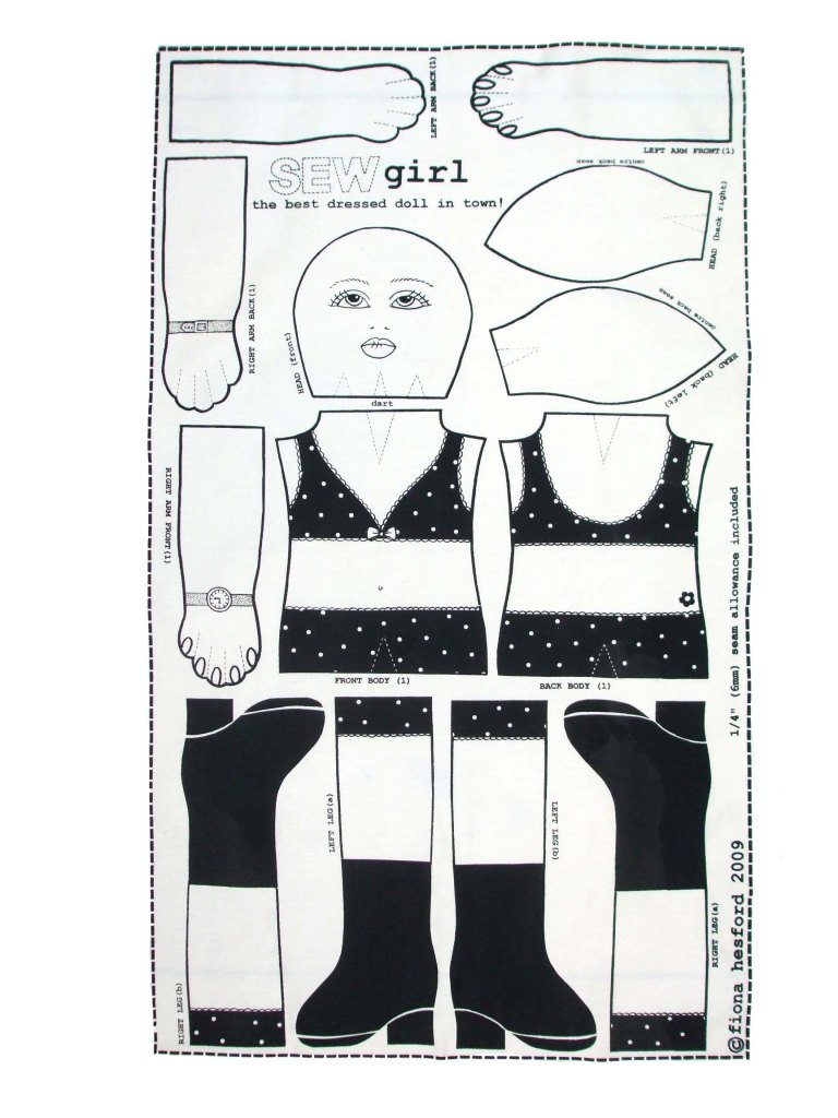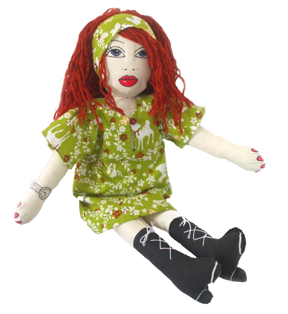 Sewgirl Doll is a fashion doll made from a unique printed cotton panel. She features a watch, daisy tattoo, little natty boots and cute spotty undies.