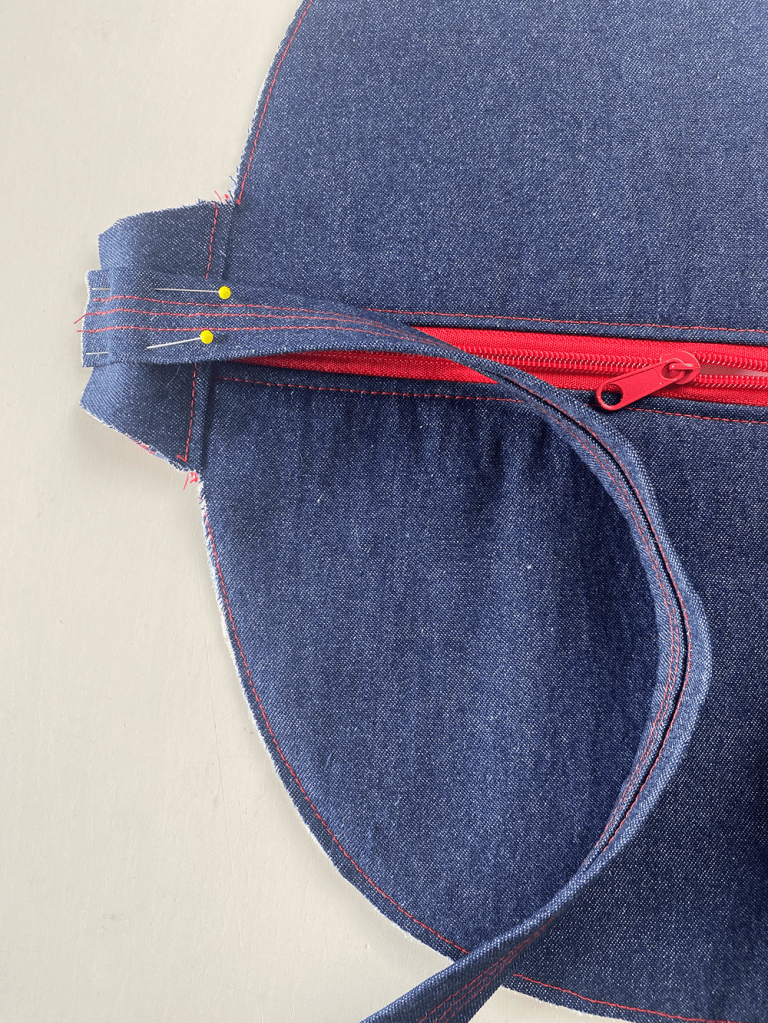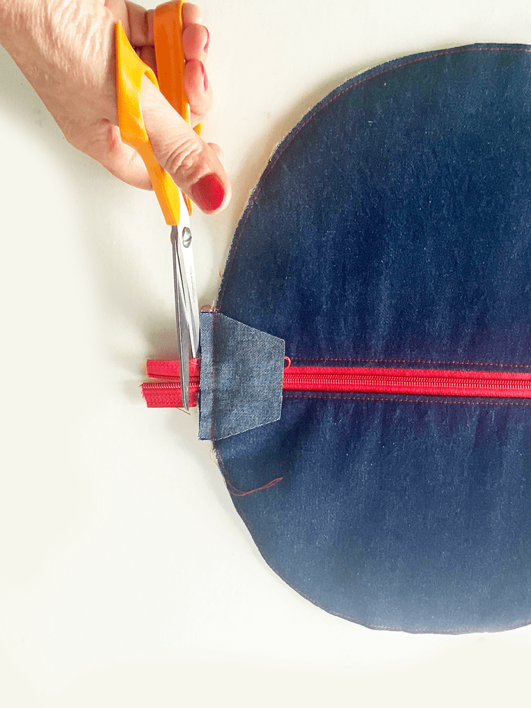 Sew across the Tab. Trim off any excess zip extending beyond the bag. Press the Tab outwards.