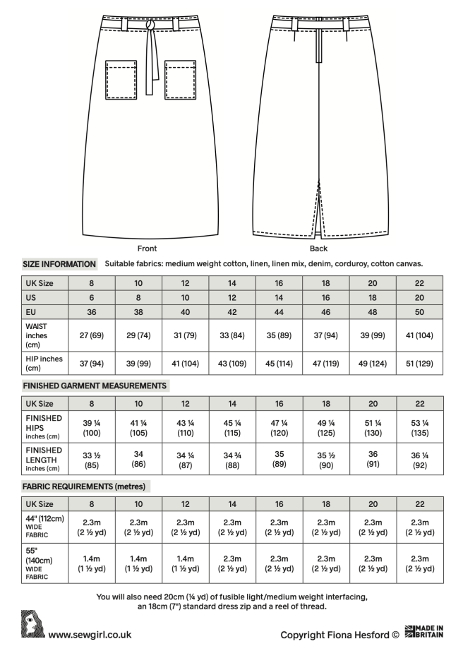 Dotty Long Skirt is available in all sizes from UK 8-22 for size information, finished garment details and fabric requirements please check out the chart below.
