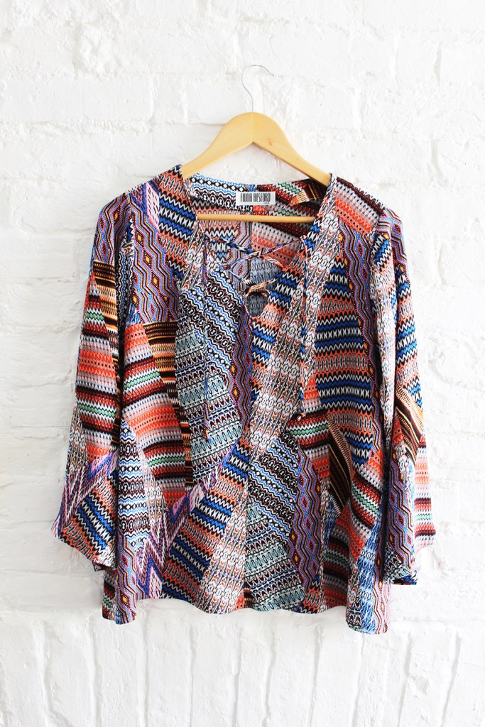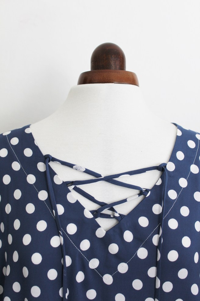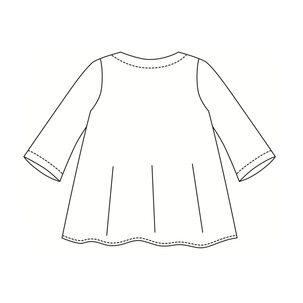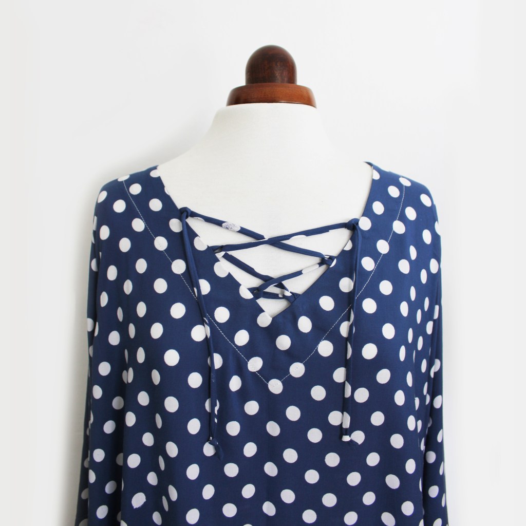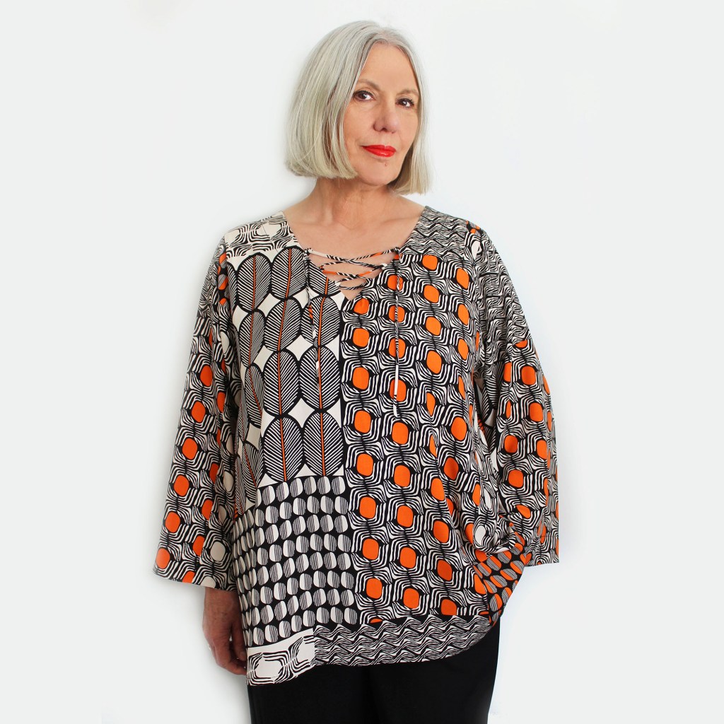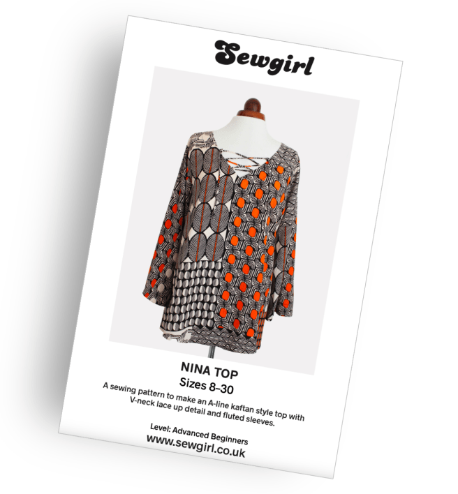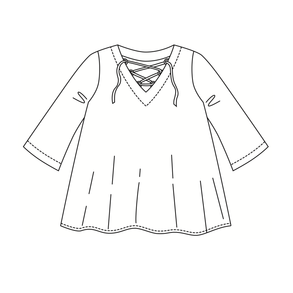 Nina top sewing pattern to make a long trapeze A-line shape, kaftan style top with a lace up V-neck detail and fluted sleeves. Suitable for viscose fabric, Tencel, lightweight linen or any fabric with good drape.