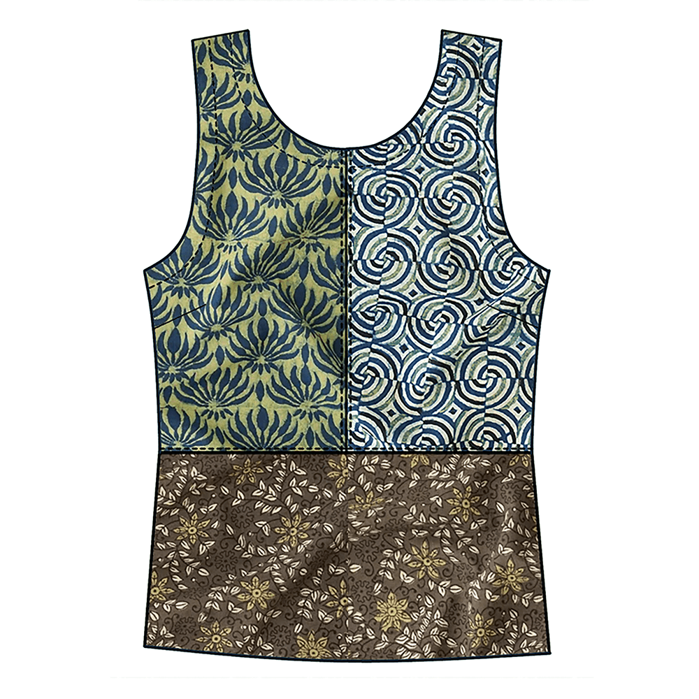 You just need to supply some lightweight interfacing and thread with some basic equipment. There’s lots you can do with this pattern, from simple things like adding the back pocket to the front bodice, or mixing different fabric together to make a patchwork garment (see above pic). A nice idea for holidays.